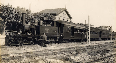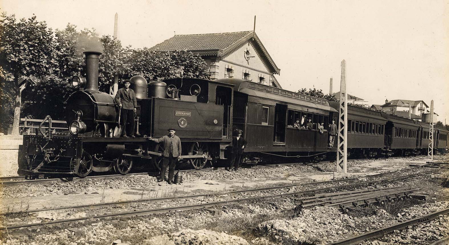 Tren fotografiado en la estación de Algorta en el año 1927. Se aprecian los postes levantados para la nueva electrificación. Archivo municipal de Getxo