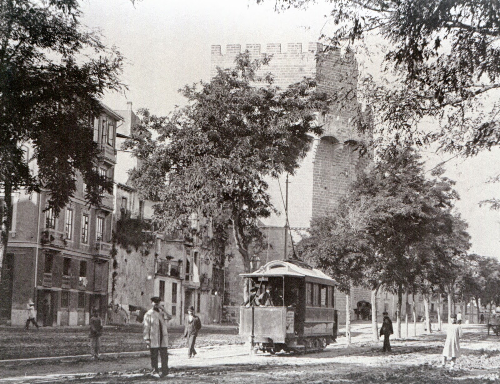 Uno de los primeros tranvías eléctricos de Valencia a su paso junto a las Torres de Serranos. Archivo EuskoTren/Museo Vasco del Ferrocarril