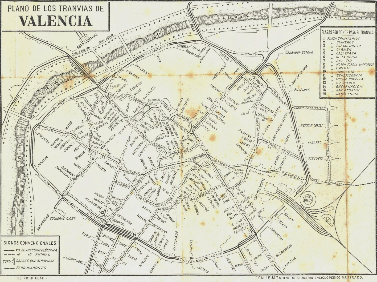 El plano de los tranvías de Valencia que encabeza estas líneas está datado, aproximadamente, en 1910 y, por tanto, fue dibujado en plena transición del motor de sangre al eléctrico. Así, en trazo continuo están reflejadas las líneas que, en aquel momento, ya eran explotadas con tranvías eléctricos, mientras que en líneas discontinuas figuran las que todavía contaban con mulas para el arrastre de sus servicios.