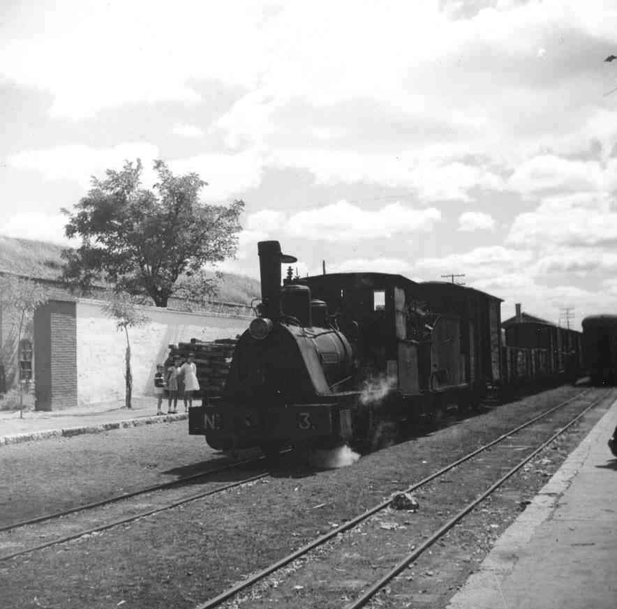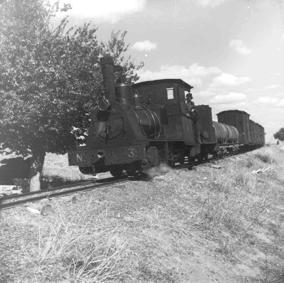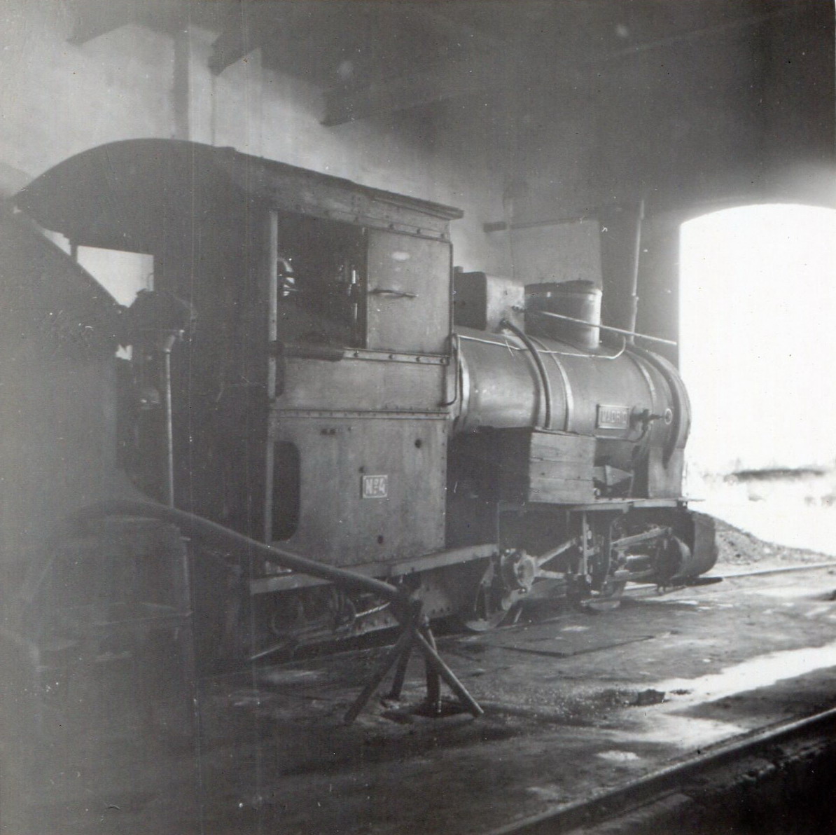 Una de las pequeñas locomotoras de vapor del ferrocarril de Valdepeñas a Puertollano, fotografiada en los talleres de esta línea. Fotografía de Martin Von Simson