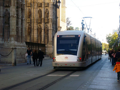 Pese a que el tranvía fue reimplantado en Sevilla en 2007, su breve historia ya nos ofrece imágenes históricas como la presente. El vehículo que protagoniza esta imagen circula ahora por la red de metro y sus sucesores funcionan en este tramo sin catenaria, gracias al uso de ultracondensadores