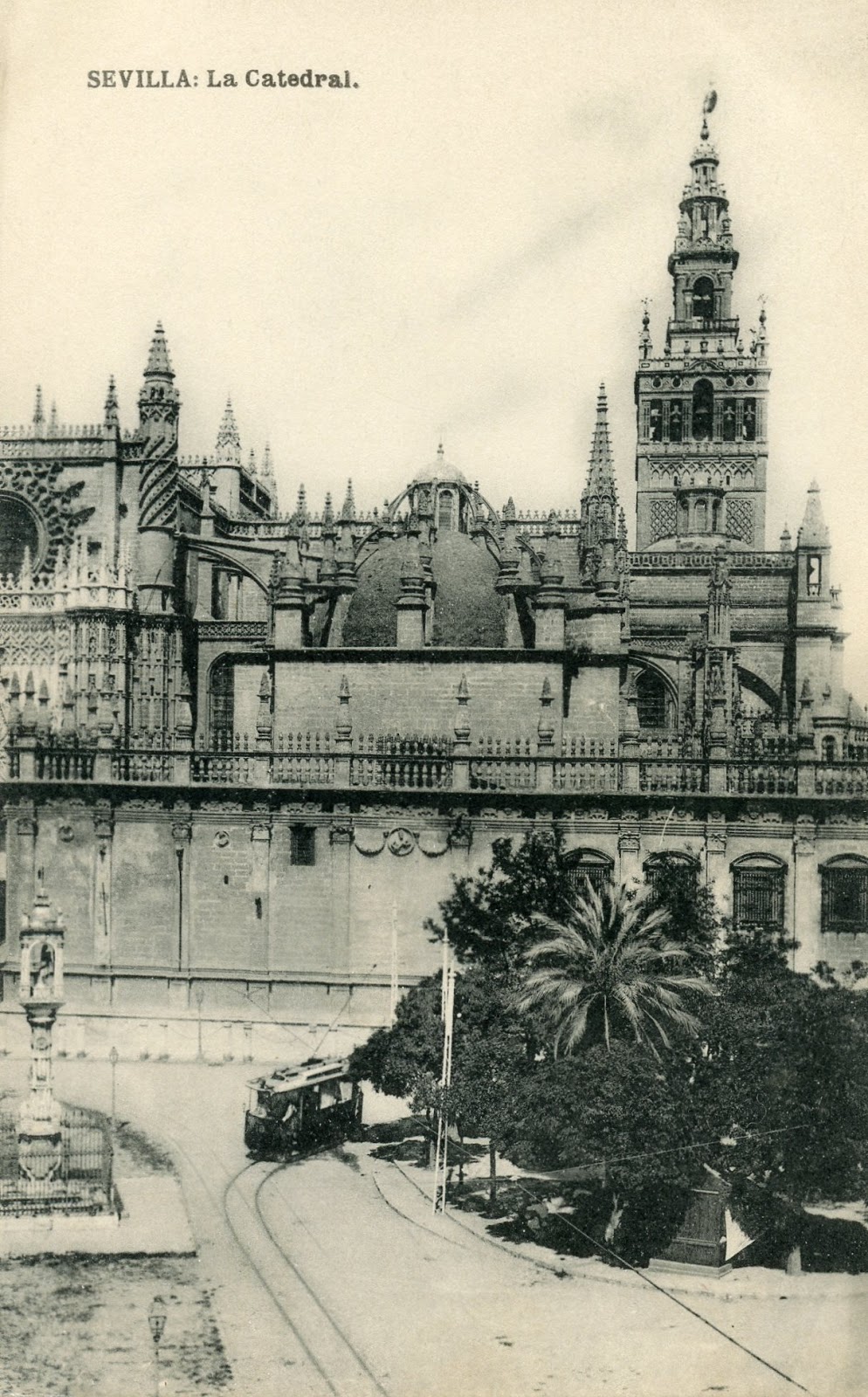 Uno de los primeros tranvías eléctricos de Sevilla, fotografiado junto a la catedral hispalense