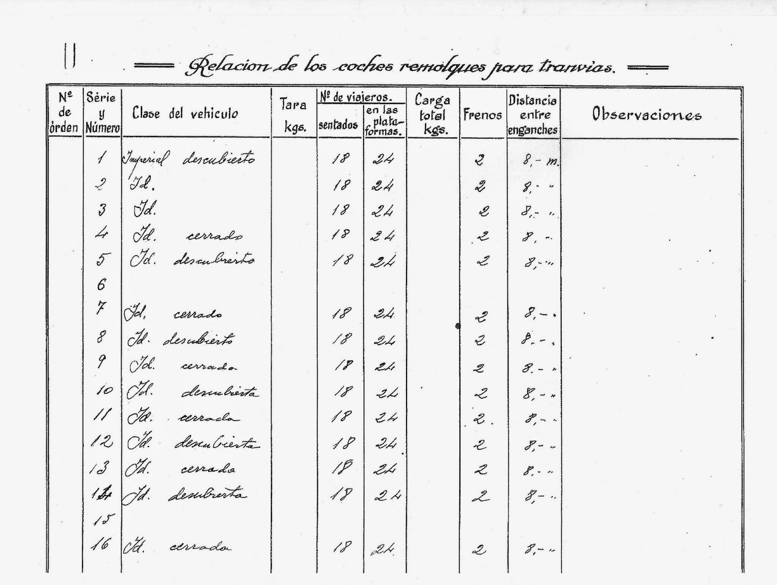 Inventario de fecha indeterminada que señala que el tranvía número 12 era un coche con imperial descubierto. Archivo Histórico de Ferrocarrils de la Generalitat Valenciana