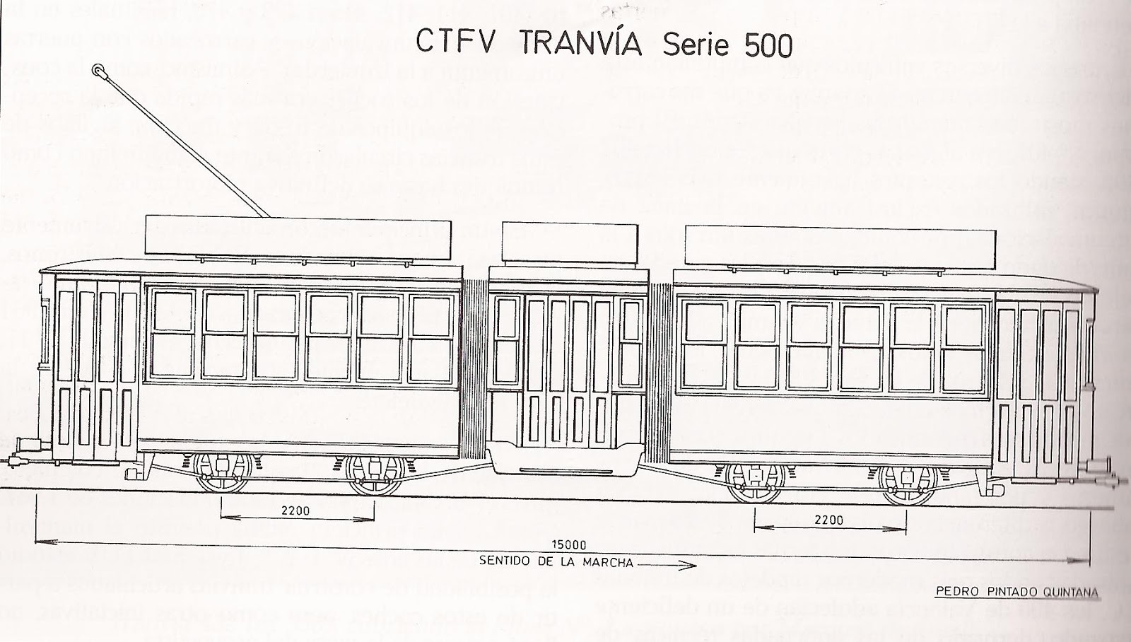 Plano de los tranvías de la serie 500 de la Compañía de Tranvías y Ferrocarriles de Valencia. Se aprecia perfectamente su configuración, conformada por dos coches motores de la serie 100 (two room) y un módulo central suspendido (a bath). Dibujo de Pedro Pintado Quintana