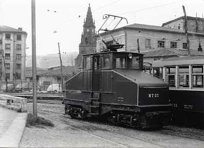 El 21, transformado en locomotora eléctrica, aunque conservando su truck original de dos ejes. Rentería, 1960. Fotografía de Juan Bautista Cabrera.