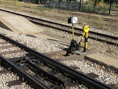 Debo confesar que hoy hace un calor difícil de soportar y, en consecuencia, me invade la pereza a la hora de afrontar la redacción de esta nueva entrada en este modesto blog. Por ello, hoy me limitaré a comentar un par de fotos que acompañan el texto, en las que se puede ver el mecanismo de talonamiento con el que contaban las agujas de las estaciones del ferrocarril de San Sebastián a la frontera francesa, el popular "Topo".