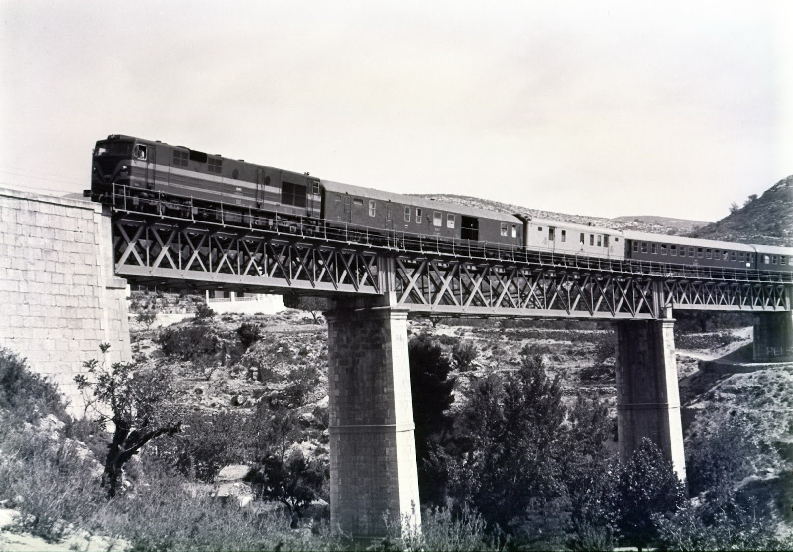 Tren correo a Madrid fotografiado sobre el viaducto del Ronquillo en Bunyol