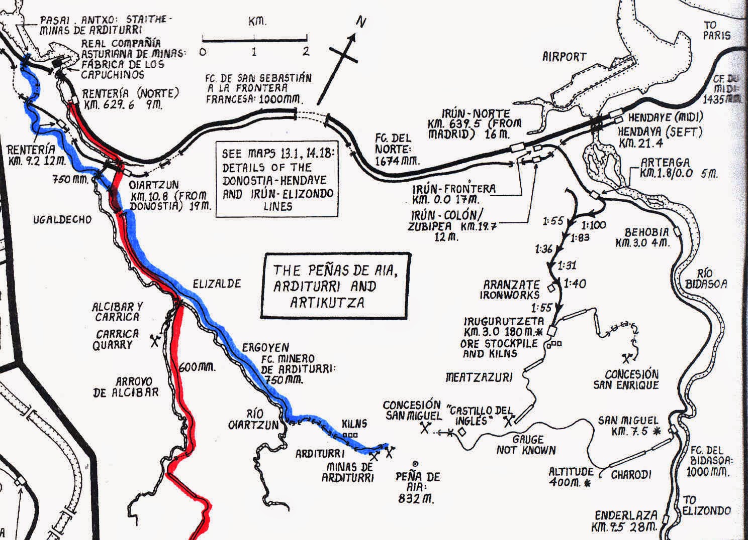 Ferrocarriles en el entorno de las Peñas de Aya. Dibujo de Mike Bent