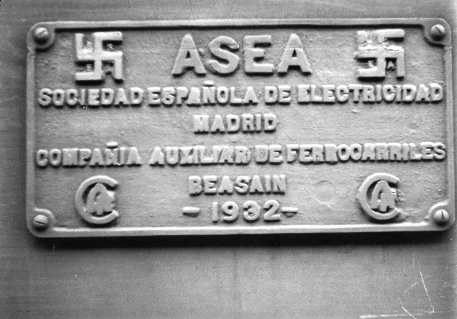 Sin embargo, no existe ninguna relación entre estas locomotoras y el diabólico régimen instaurado en Alemania por Adolf Hitler. Estas máquinas fueron construidas entre 1931 y 1932 por la Compañía Auxiliar de Ferrocarriles, CAF, en su factoría de Beasain, con equipos eléctricos de la multinacional sueca Allmänna Svenska Elektriska AB, más conocida por sus iniciales ASEA. Esta empresa, constituida en 1883, decidió, a finales del siglo XIX, utilizar como logotipo la cruz gamada, emblema de gran tradición histórica y utilizado por numerosos pueblos, desde la India hasta Escandinavia, como símbolo de buena suerte. Con su adopción, ASEA simplemente deseaba representar la rotación de sus principales productos: motores eléctricos, generadores, turbinas hidráulicas y de vapor. Éste, y no otro, era significado de las cruces gamadas de las placas que ostentaban estas locomotoras, en cuyos cuarteles figuraban las iniciales de esta sociedad sueca.