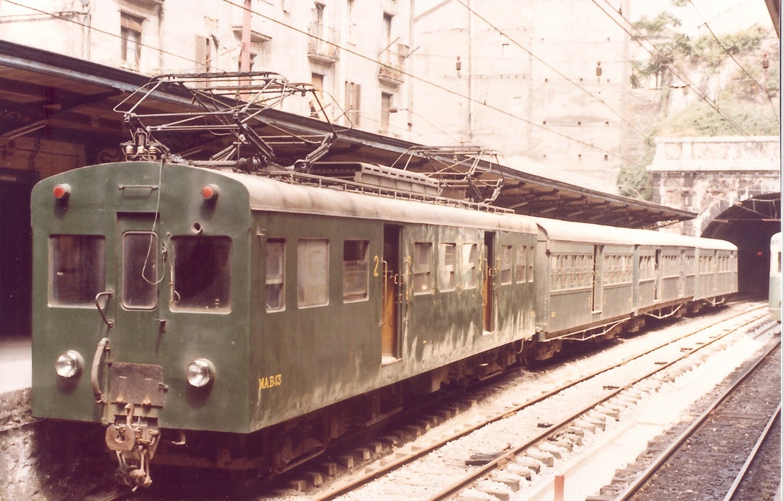 Automotor MAB-13, con una composición clásica de coches de madera, fotografiado en la estación de Bilbao-Aduana. Fotografía de Raymond Hubert