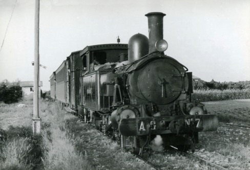 Tren del ferrocarril de Alcoy a Gandía, que utilizaba el tope central con enganche de cigüeñal. Fotografía de Jordi Casaponsa. Fondo Ángel López Sanz. Archivo EuskoTren/Museo Vasco del Ferrocarril