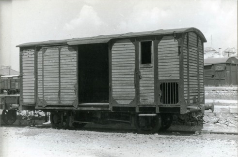 Un vagón cerrado del ferrocarril de Villena a Alcoy y Yecla. Se aprecia igualmente, el doble tope. Fotografía de Jordi Casaponsa. Fondo Ángel López Sanz. Archivo EuskoTren/Museo Vasco del Ferrocarril