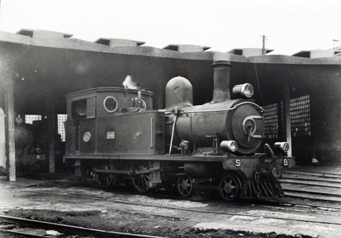 Locomotora Gama, del Santander-Bilbao, fotografiada en el bilbaíno depósito de La Casilla. Fotografía de L.G. Marshall. Archivo EuskoTren/Museo Vasco del Ferrocarril