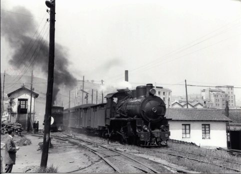 Una locomotora de vapor del Santander-Bilbao maniobra en Balmaseda. Fotografía de Ferrán Llauradó. Archivo EuskoTren/Museo Vasco del Ferrocarril