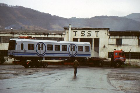 Transporte de un coche motor de la serie 300. El traslado de las nuevas unidades desde Beasain al punto de descarga en la red de EuskoTren en Lasarte exigía una curiosa maniobra en la que el camión debía girar 180º en la explanada de las cocheras de los antiguos trolebuses de San Sebastián a Tolosa. Fotografía de Juanjo Olaizola Elordi