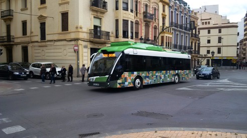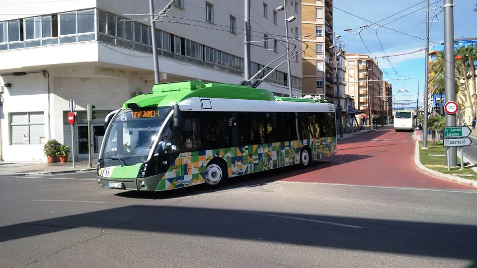 Una de las redes de trolebuses europeas más recientes es la de Castelló. Parte del recorrido, en el centro histórico de la ciudad, lo realiza en "Wifi", es decir, sin líneas aéreas de alimentación, mientras que el resto del trayecto procede a la carga lenta de sus baterías. Fotografía de Juanjo Olaizola Elordi