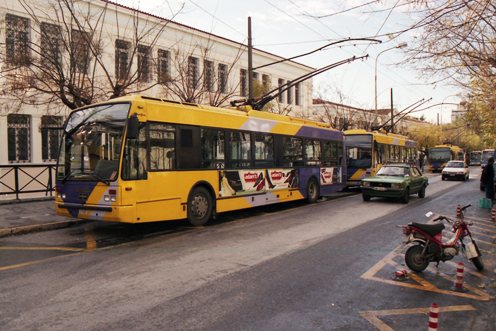 Trolebuses de Atenas. Los cuatrocientos trolebuses en servicio en la capital griega contribuyen decisivamente a reducir los graves problemas ambientales de esta ciudad. Fotografía de Juanjo Olaizola Elordi