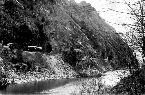 Un tren de viajeros del Ferrocarril del Bidasoa, a punto de penetrar en un túnel de la línea. Archivo EuskoTren/Museo Vasco del Ferrocarril