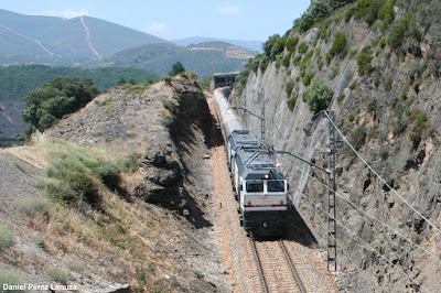 | Pablo Dieguez nos ha cedido esta imagen de un mercancías encabezado por una 251 saliendo por la boca norte (Lado Ponferrada) del túnel 16, el denominado "El Lazo" y que da nombre a todo el trazado ferroviario de la zona. |