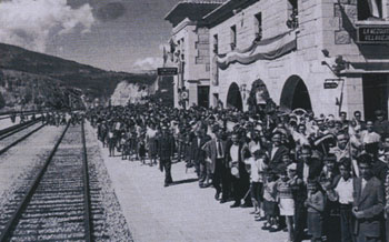 La multitud aguarda el tren inaugural Puebla - Orense en la estación de A Mezquita-Vilavella, 1 de julio de 1957 |