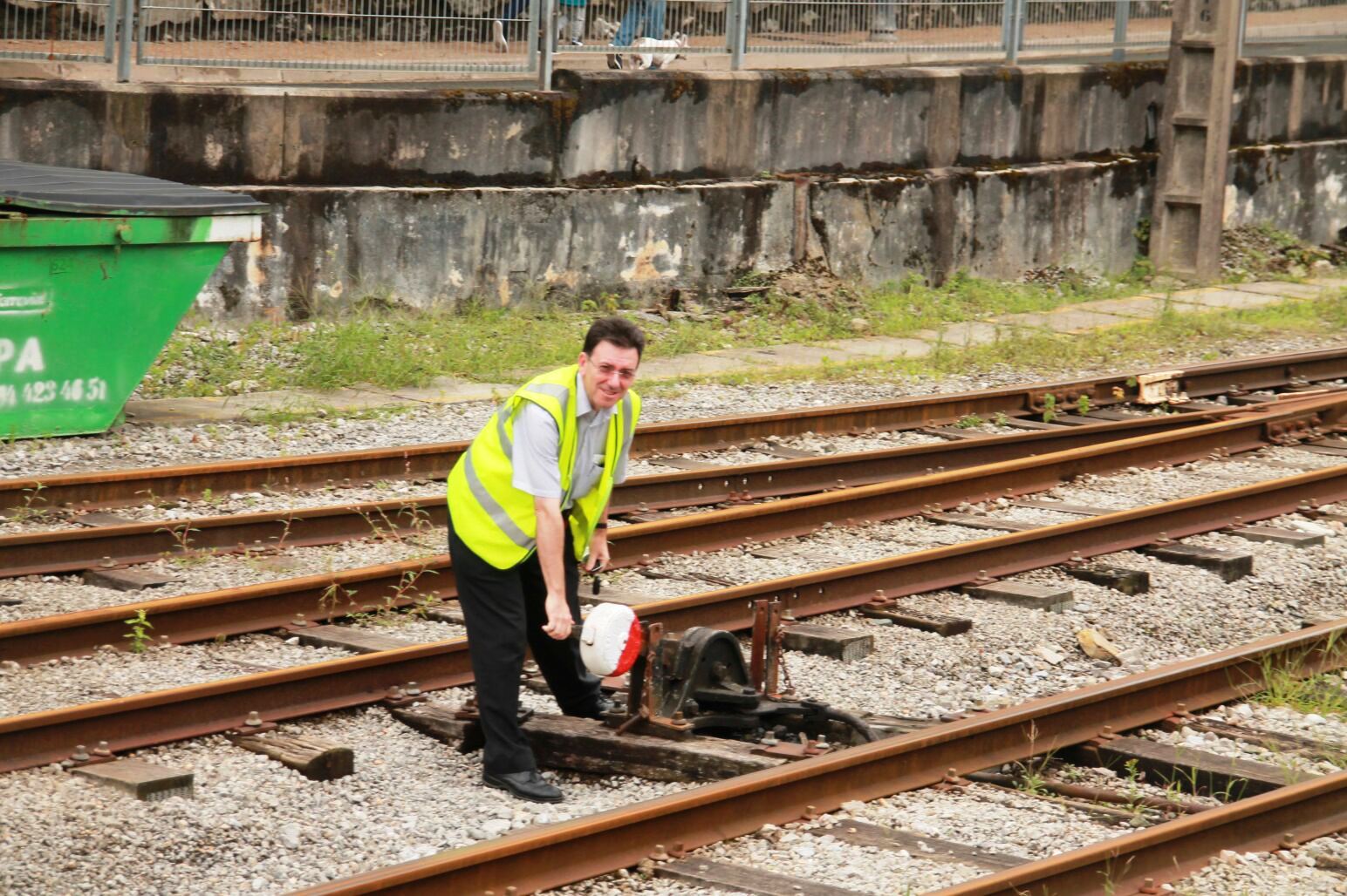 Última maniobra de la aguja de acceso a los talleres de Rentería, para dar salida a un tren comercial. Fotografía de Pedro Mª Pérez Amuchástegui