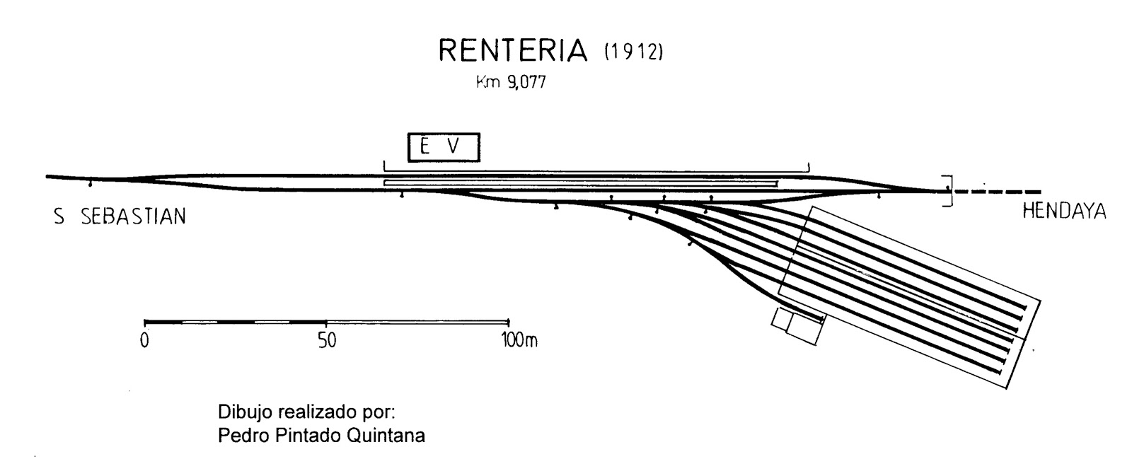 Esquema de vías de la estación de Rentería, en el que se observa la disposición de las cocheras. Dibujo de Pedro Pintado Quintana
