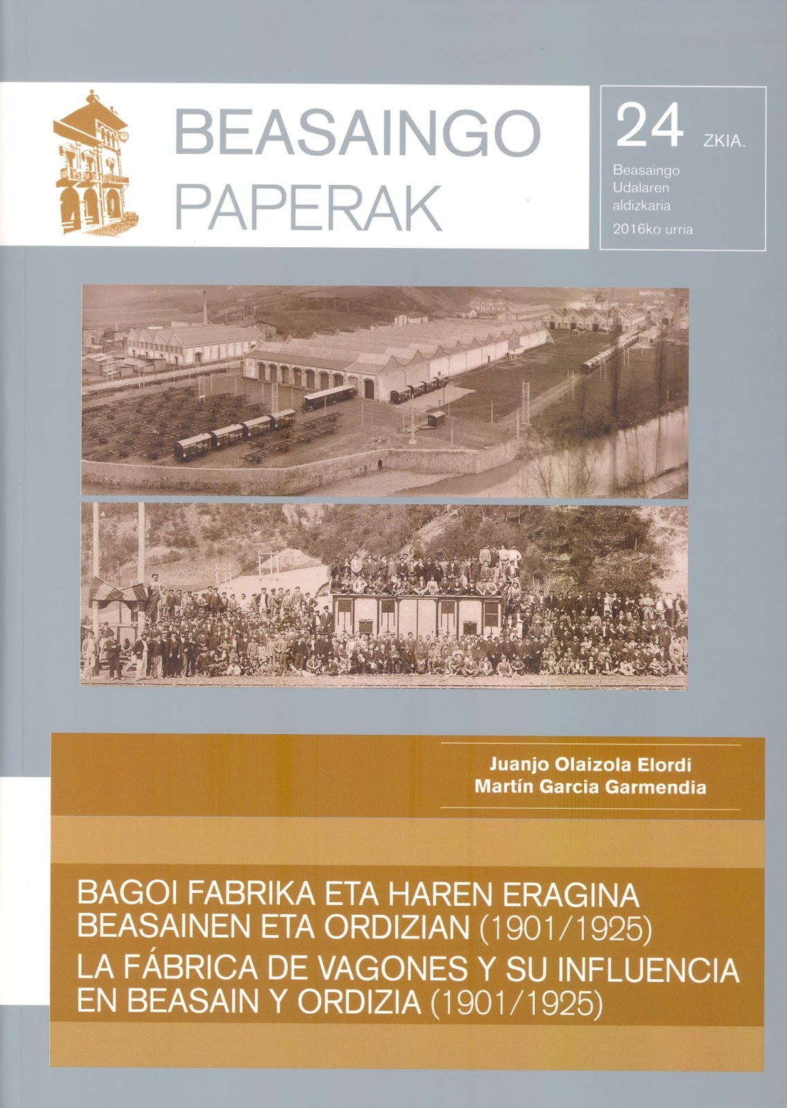 El pasado 25 de octubre se presentó en la torre de Igartza (Beasain), el Nº 24 de la colección Beasaingo Paperak. En esta ocasión, y como bien señala el título del nuevo volumen, “La fábrica de vagones y su influencia en Beasain y Ordizia (1901-1925)” el trabajo, obra de los historiadores Juanjo Olaizola Elordi y Martín García Garmendia, estudia la historia de la fábrica de vagones que estableció en 1905 la Sociedad Española de Construcciones Metálicas en Beasain y las repercusiones que esta importante industria tuvo sobre las poblaciones del entorno más inmediato, sobre todo Beasain y Ordizia, pero también, en otras como la vecina Lazkao.