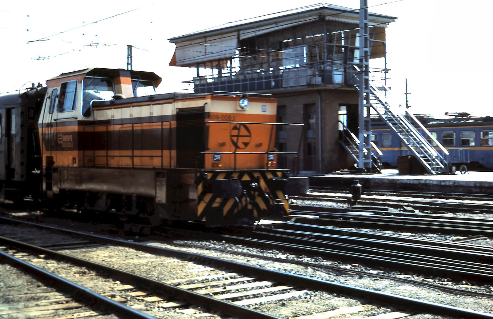 | 309-008 en Atocha con su inconfundible caseta de enclavamientos en segundo plano. Al fondo, una 440 en colores originales. Marzo del 87 (Foto: Ángel Rivera) |