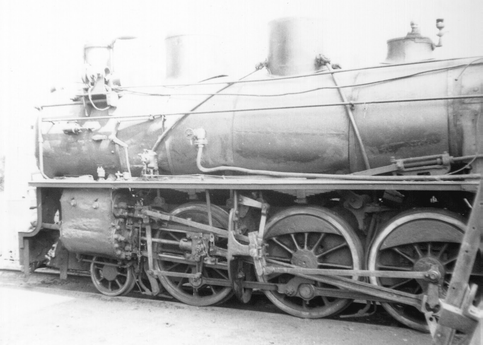 La Krauss "Engerth" nº 17 a finales de los 70. Se aprecian perfectamente los travesaños de apoyo del tender sobre el último eje motor (Foto: Ángel Rivera)