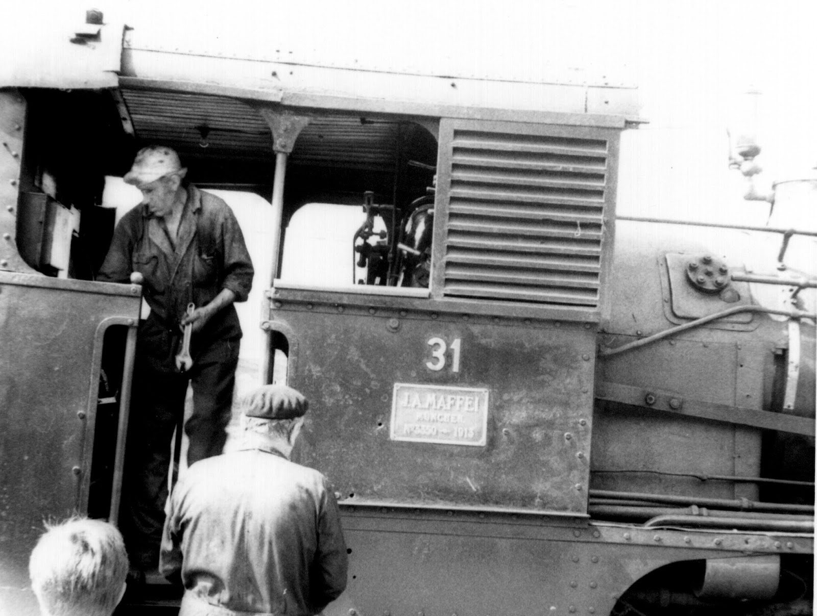 Pero la joya de la corona, o al menos la locomotora de la compañía que gozó de más popularidad siempre fue, otra Engerth, la Maffei PV 31, construida en 1913 y proveniente del ferrocarril Pamplona-Lasarte donde tenía el número 6. Encabezó otra decena distinta a las Krauss y MACOSA ya que no disponía de recalentador. Aunque hizo tanto trenes de mercancías como de viajeros, fue durante muchos años la titular del mítico "correo" y a la cabeza del mismo ha quedado mundialmente inmortalizada en muchísimas fotos. Aquí va mi pequeño homenaje a la 31 con estas imágenes de finales de los 70: