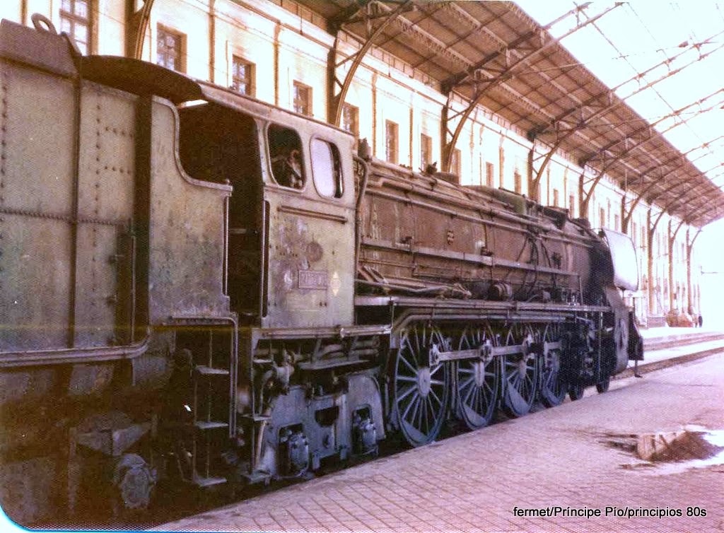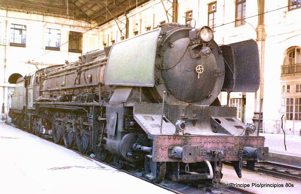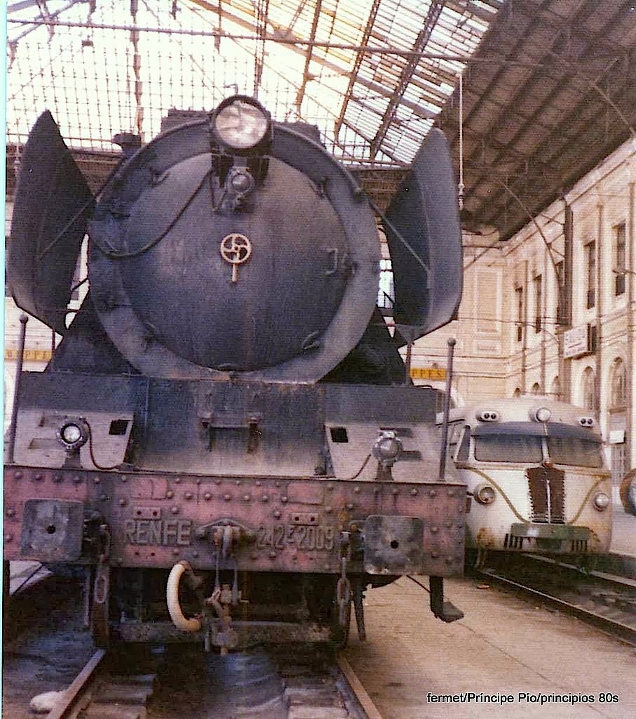 Aunque no tuve ocasión de fotografiarlas durante sus servicios, y bien que lo siento, me encontré por primera vez con la última superviviente, la 242F-2009, muy a principios de los 80 en la estación de Príncipe Pío de Madrid, que ya estaba clausurada, y donde estaban empezando a agruparse algunas de las piezas de material móvil que engrosarían el futuro Museo Nacional Ferroviario. Me causó gran impresión entrar en la playa de vías y encontrarme con la Confe absolutamente a solas. A solas de personas quiero decir, porque ella estaba flanqueada por el talguillo 9004-9010 y, un poco más allá por el automotor Ganz 9212.