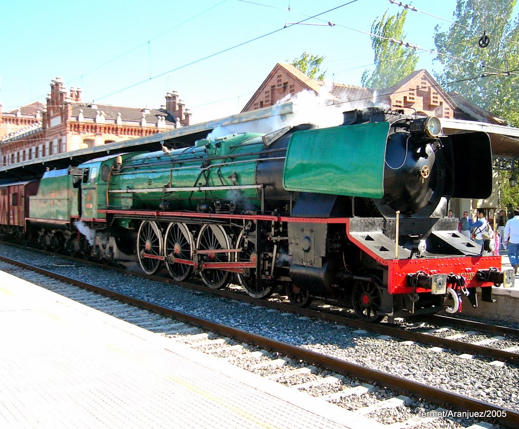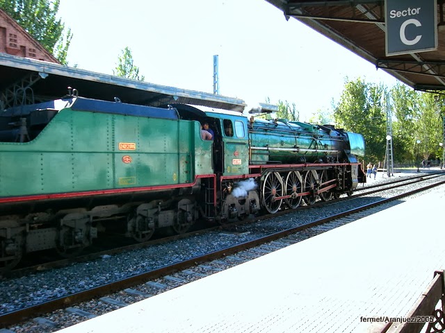 Éste fue mi primer encuentro con la 2009. Años después, en 1988, fue reparada y puesta en orden de marcha en los Talleres Generales de RENFE de Valladolid y retornó al Museo. Fue probablemente tras esa reparación cuando se grabó este vídeo; en cualquier caso vale la pena contemplarlo porque ahí se puede ver perfectamente el poderío y elegancia de esta locomotora. Luego, en 2005, otra nueva reparación en los prestigiosos talleres de la ARMF de Lleida y otra vez triunfante a la vía como muestra este otro vídeo. A continuación una exhibición en un día de puertas abiertas en las vías del Museo de Delicias. Poco tiempo después, grande fue la alegría de los aficionados cuando nos enteramos que se iba a hacer cargo de algunos de los "trenes de la fresa" entre Madrid y Aranjuez. Pero sólo fue uno. Al parecer algún problema surgió durante el viaje de ida o en la inversión en Aranjuez, de tal modo que por la tarde ya volvió a Madrid remolcada por la diesel 2180. Por suerte pude estar presente en este viaje y fue, de nuevo, emocionante. Impagable verla entrar por la curva que da acceso a la estación; ahí pude rodar este pequeño vídeo de muy mala calidad pero que merece la pena, más que verlo, escucharlo. Una vez estacionada, pude sacar algunas fotos que muestro a continuación: