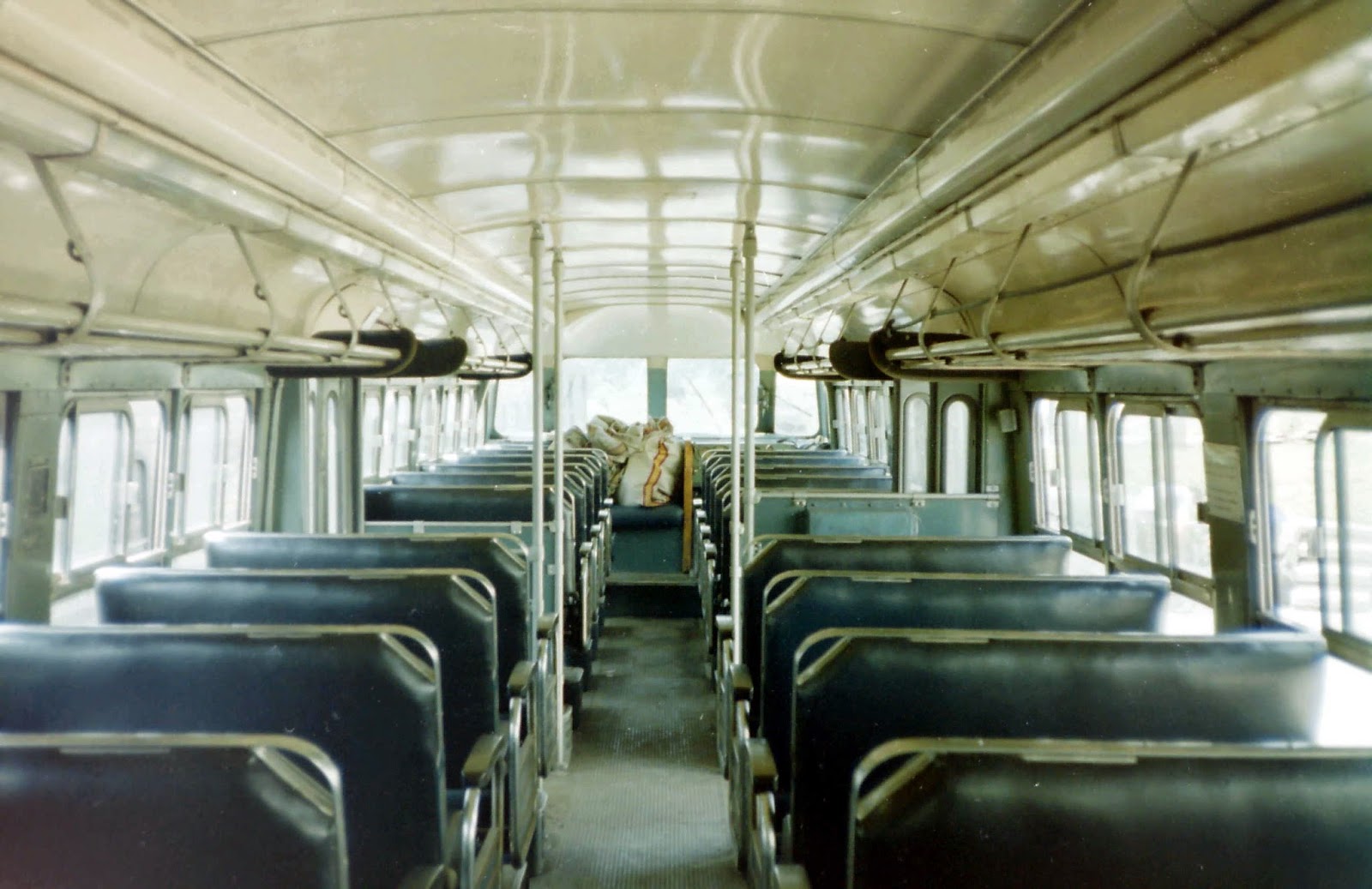 Naturalmente me faltó tiempo para viajar en el "talgo" hasta no sé cuál estación de la línea, probablemente hasta Noreña. Disfruté examinándolo por fuera y por dentro, hice las fotos que pude con mis mediocres cámaras y disfruté de sus americanos asientos de cuero. Desde entonces no perdí de vista ese "talgo" e incluso lo fotografíe, ya retirado, tras el cambio de ancho de vía en otra visita a Gijón en 1985. Aunque el estupendo Museo del Ferrocarril de Asturias no parece que haya podido conservar ninguno de sus coches, tengo entendido que existen algunos en propiedades particulares. En cualquier caso hace poco tiempo volví a acordarme de él cuando vi en un NO-DO de 1955 un reportaje "triunfal" sobre la explotación del Talgo II en una línea norteamericana. (Ver aquí a partir del minuto 3:28). Supongo que era este "talgo" y que aquel servicio no tuvo ninguna continuidad vendiendo el tren poco después al Langreo.