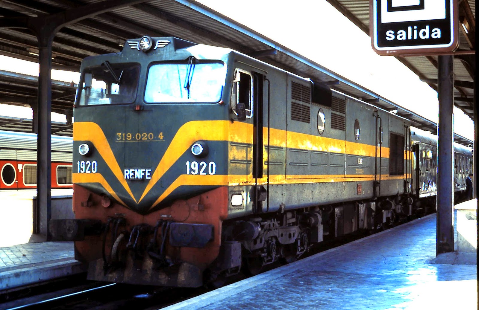 | La General Motors 319-020 en cabeza del omníbus Madrid-Valencia durante una época en que salía de Madrid-Chamartín por obras en Atocha |