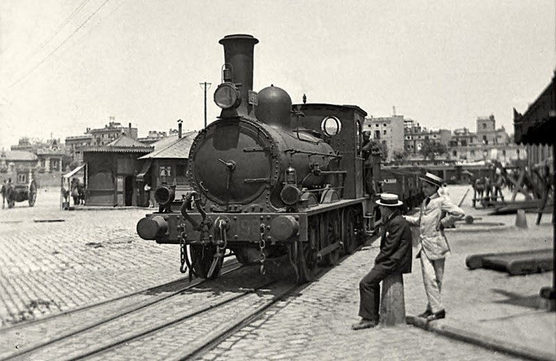| Otra locomotora de la misma serie ¿quizás la 198? en la zona portuaria de Barcelona en 1922 (Foto-postal Cuyás) |
