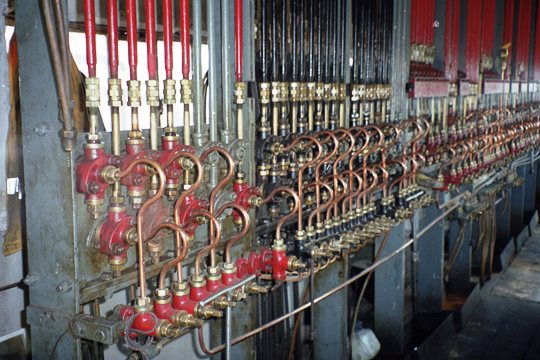 Cabina de control del enclavamiento de Algodor. Destacan los grandes contrapesos del sistema hidráulico. Fotografía de Juanjo Olaizola Elordi