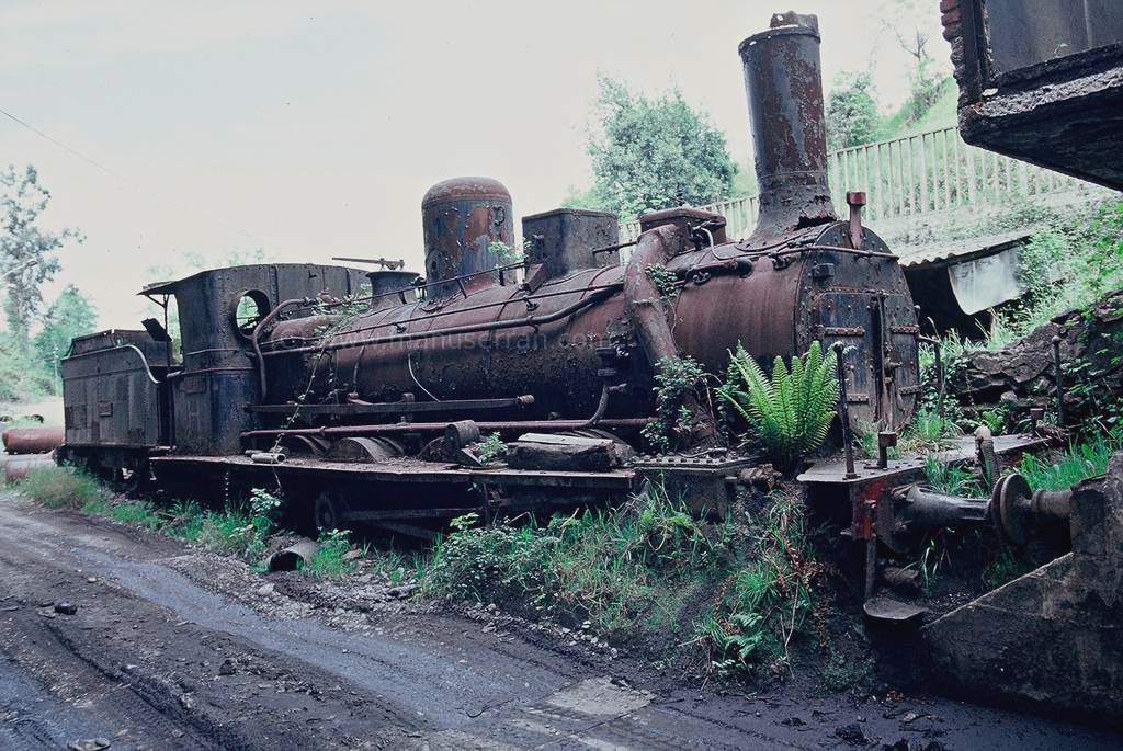 La 040-2169 (2708 en Norte) abandonada en Guadix tras haber trabajado en" spaguetti westerns"· tal como atestigua ese apartavacas destrozado y la numeración que luce el tender (Foto: Walter Bonmartini)