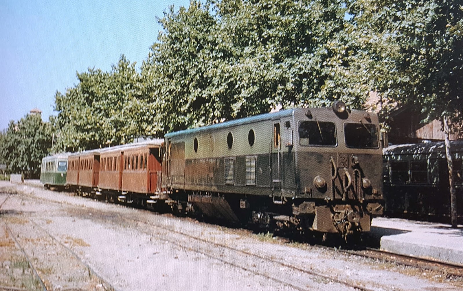 | Una imagen realmente valiosa: La 1158 encabeza un tren de pasajeros en la zona norte de Valencia en 1984. A la derecha, dos automotores Billard (Foto: Enrique Gramaje y Juanjo Olaizola) |