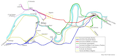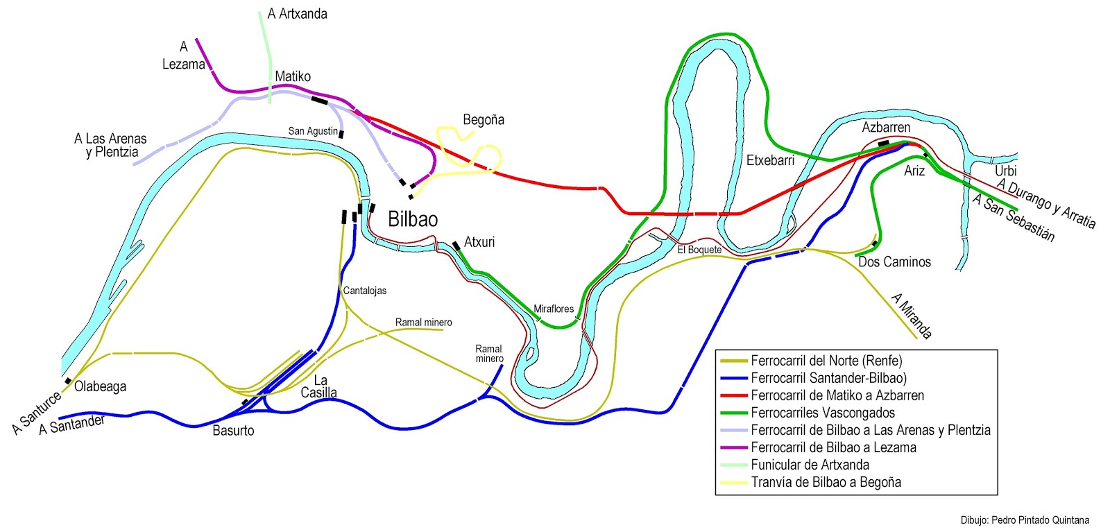 Red ferroviaria en el entorno de Bilbao. Dibujo de Pedro Pintado Quintana