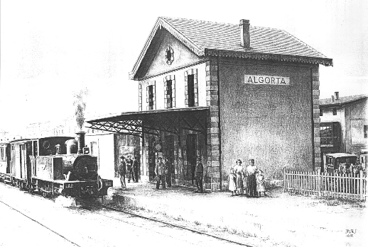 Tren a su paso por la estación de Algorta. Dibujo de José Vicente Coves Navarro