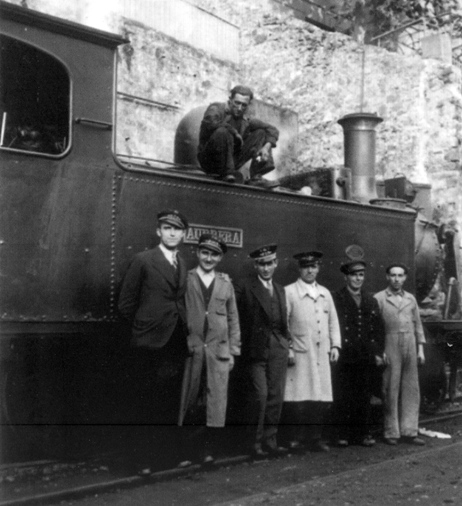 La locomotora "Aurrera", hoy titular de los trenes históricos del Museo Vasco del Ferrocarril, fotografiada en la estación de Bilbao-Calzadas con un grupo de ferroviarios del tren de Lezama. Archivo EuskoTren/Museo Vasco del Ferrocarril