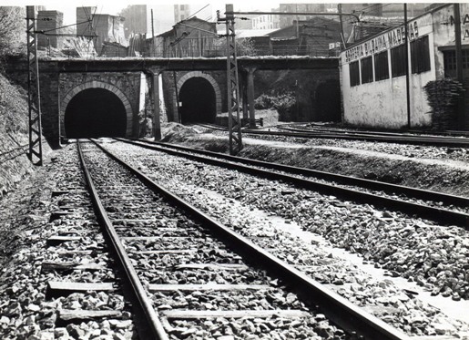 Vista de la entrada a Matiko desde Bilbao. A la izquierda, la vía doble de la línea de Bilbao a Plentzia, en el centro, el túnel del Matiko-Azbarren y a la derecha, la vía a Bilbao-San Agustín. Archivo EuskoTren/Museo Vasco del Ferrocarril