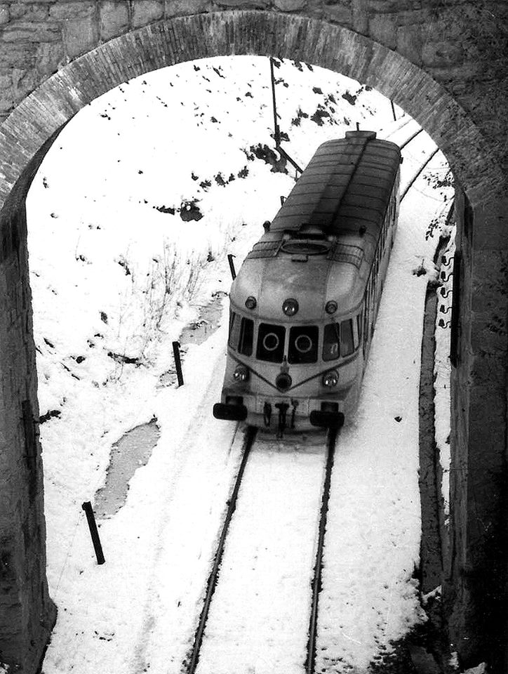 Un ABJ-7 del segundo grupo en las cercanías de Jaca haciendo un servicio Canfranc-Zaragoza en noviembre de 1971 (Foto: Miquel Palou) |
