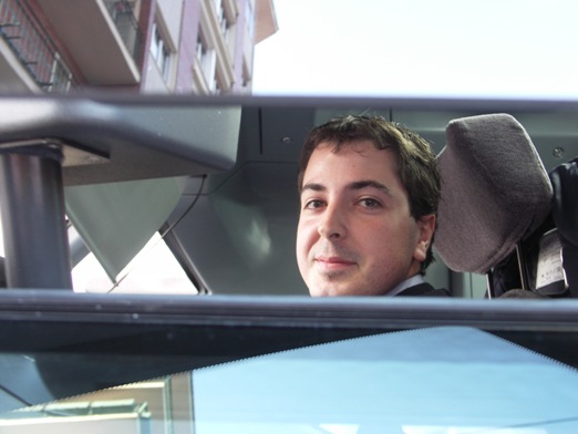 El conductor Hodei Goldarazena, fotografiado a los mandos de un tranvía el día de la inauguración del primer servicio en Gasteiz. Fotografía de Juanjo Olaizola Elordi