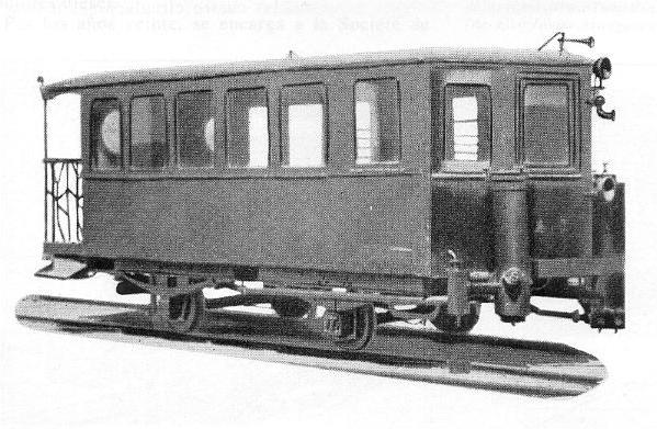 Pero quizás, en aquella visita, Francisco Martínez conoció algunos pequeños automotores también con motor de gasolina y volvió con la idea de construir uno para su línea. Ni corto ni perezoso en 1922 puso al taller de la compañía manos a la obra. Parece que eligió un antiguo coche de viajeros comprado a MZA, al que dotó del motor de un automóvil Overland de muy poca potencia complementado con una caja de cambios y una transmisión por cadena a uno de los dos ejes del vehículo. Al no disponer de radiador se dispusieron debajo de los asientos dos depósitos de agua con una capacidad total de 500 litros (supongo que para una circulación continua de agua fría). Además, para aumentar el esfuerzo de tracción, que era de 600 kg, se le colocaron ruedas de menor diámetro (0,550 m) montadas sobre unos ejes nuevos con cajas de grasa de rodamientos.