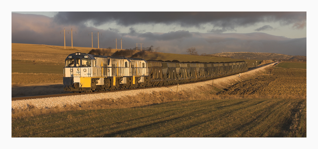 | Una GECo del Tajuña arrastrando un tren de tolvas (foto: autor desconocido) |