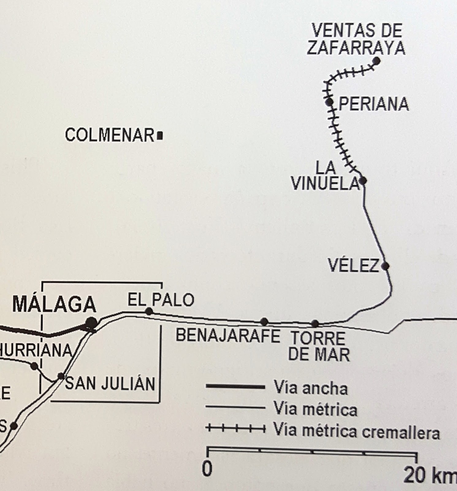 Pero no acabaron ahí mis sorpresas. Años después me enteré que, por un camino muy cercano a la carretera, ascendió -y descendió- durante muchos años desde y hasta Vélez Málaga y Málaga un ferrocarril arrastrado por locomotora de vapor y dotado durante tres tramos de su recorrido de sistema de cremallera; algo que hasta entonces yo sólo identificaba con los ferrocarriles de Nuria y de Montserrat. Desde entonces tuve muchos deseos de profundizar en la historia de este tren. Ahora lo he podido hacer y me encanta compartirlo en este blog.