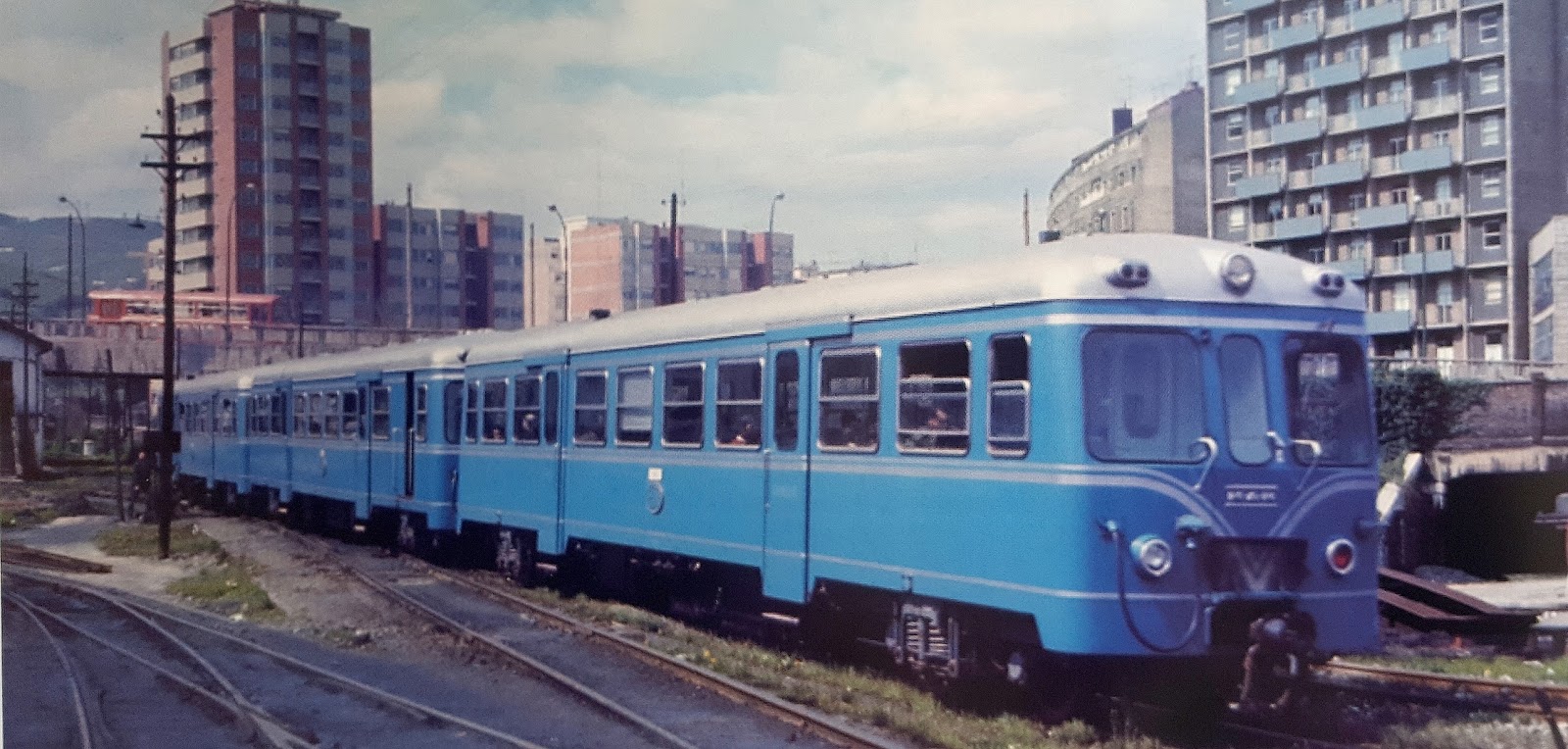 | Una composición MAN recién reformada y con la nueva librea sale de Gijón con destino a Pola de Laviana, pasada ya esta línea al ancho métrico. Agosto de 1983 (foto: Ángel Rivera) |