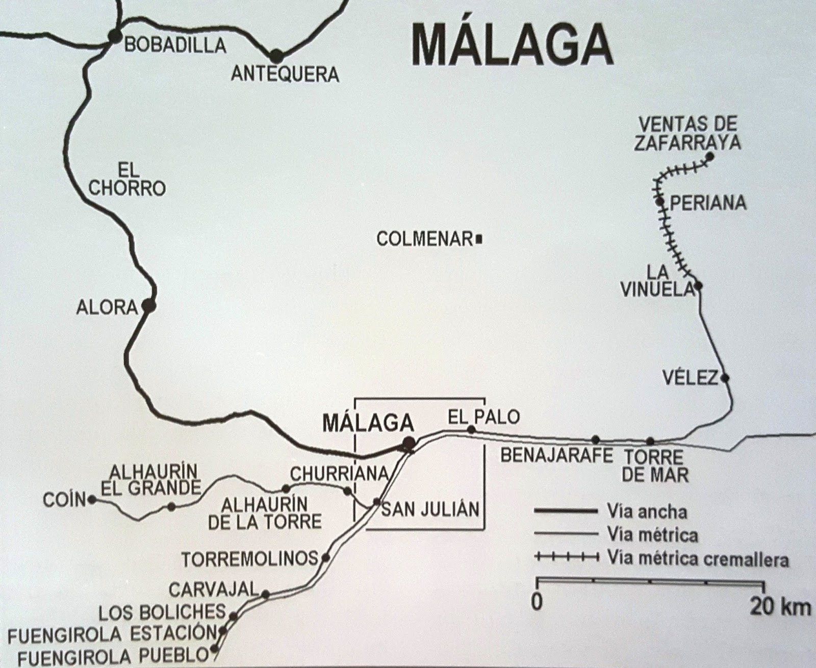 En entradas anteriores de estas "Crónicas de la vía estrecha" hemos recorrido los ferrocarriles mineros de Huelva y Sevilla y llegado hasta los muelles del Guadalquivir en San Juan de Aznalfarache. Cruzamos ahora el "río grande" hacia el sur y nos dirigimos hacia la ciudad de Málaga desde donde partieron durante bastantes años tres interesantes líneas de vía estrecha: Málaga a Coín, Málaga a Vélez Málaga y Ventas de Zafarraya y Málaga a Fuengirola.