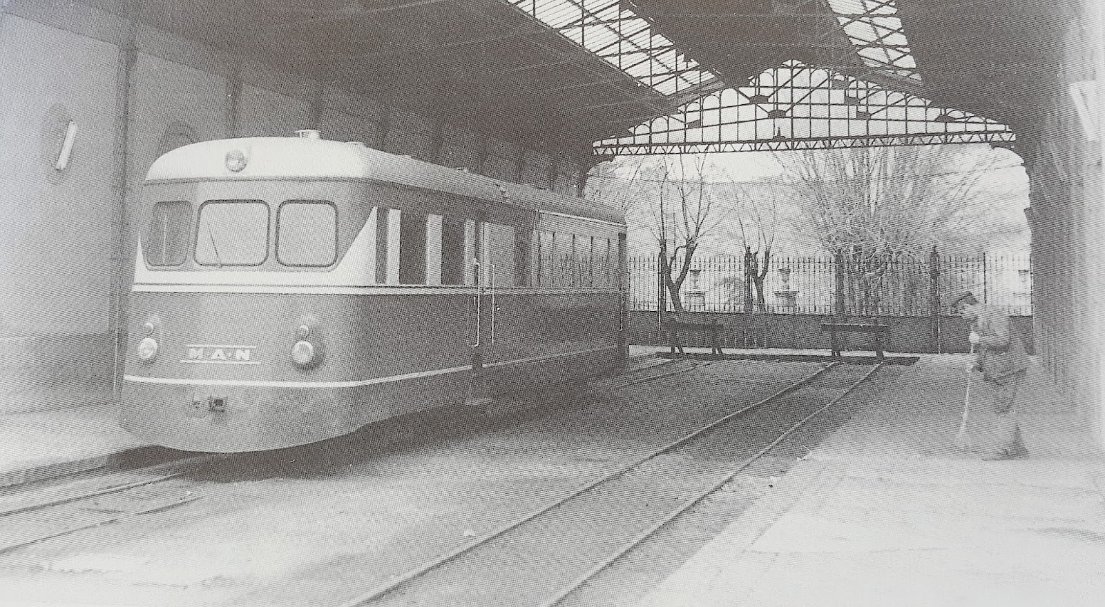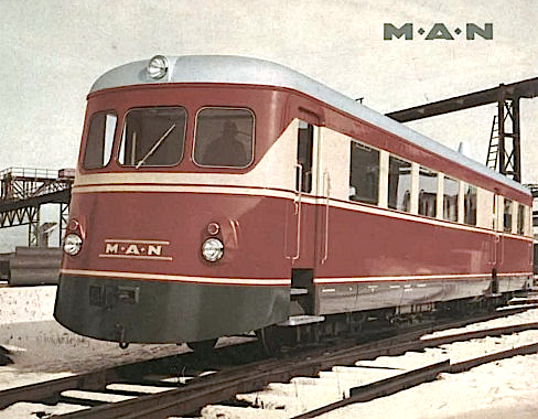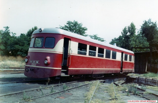 Cuando veía fotos de la antigua estación de Goya en Madrid, cabecera del ferrocarril de Madrid a Almorox, me llamaban la atención unos elegantes automotores con el logotipo "MAN" que destacaban mucho comparados con las espartanas imágenes de los Billard o de las locomotoras Batignolles, que en aquellos finales de los 50 y en los 60 estaban también por allí. Mi sorpresa fue aún mayor cuando pude contemplar en los reportajes cinematográficos de Julián de Elejoste, tan admirablemente recuperados por Gustavo Vieites y Vía Libre, que su librea era roja y crema, lo cual, a mi juicio, realzaba aún más su elegancia.